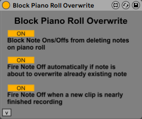 | Description: | Video: https://youtu.be/xp39V7X5gCw Block Piano Roll Overwrite is a Max for Live device that does exactly what the title says: Blocks piano roll overwrite. How it works: To block piano roll overwrite on track B, place this device on track A, and route MIDI from track A to track B. Because the piano roll is the first thing that occurs in the effect chain, there's no way to block piano roll overwrite unless you block MIDI from a previous chain. This device has 3 ways of blocking piano roll overwrite, which can be turned on/off: - Blocking note ons/offs from overwriting notes on the piano roll - Automatically firing note offs when a note is about to overwrite another note on the piano roll - Fire note off when a new clip is nearly finished recording. Notes/unfixable bugs: - The intended purpose of this device is to block piano roll overwrite in MIDI clips during live performance while overdub recording. If you use it with Ableton at a reasonable tempo while playing keyboards or other MIDI instruments, it will work 100% fine. - Because Ableton's quantizer preserves note length, any note that is snapped forward can potentially overwrite a piano roll note. 2 workarounds exist: have Ableton's quantizer off, or use Nick Hyde's Custom Quantizer, which quantizes note ends independently. - If you spam it with MIDI notes, use at tempo 999, or have an extremely large amount of MIDI on the piano roll, the device may not be able to keep up, based on processor speed, etc. It has to check the entire piano roll every time a note on/off message occurs. The more notes on the piano roll, and the quicker the notes come in, the more it can potentially slow down Ableton, and the higher chance a note will slip through the cracks. Because "changes cannot be triggered by notifications" (max developers know what I'm talking about here), it is impossible to maintain an accurate list of notes in real time if the piano roll is being spammed with MIDI data. Update 5/18/21: Updated the color scheme to look like more like an Ableton stock device |