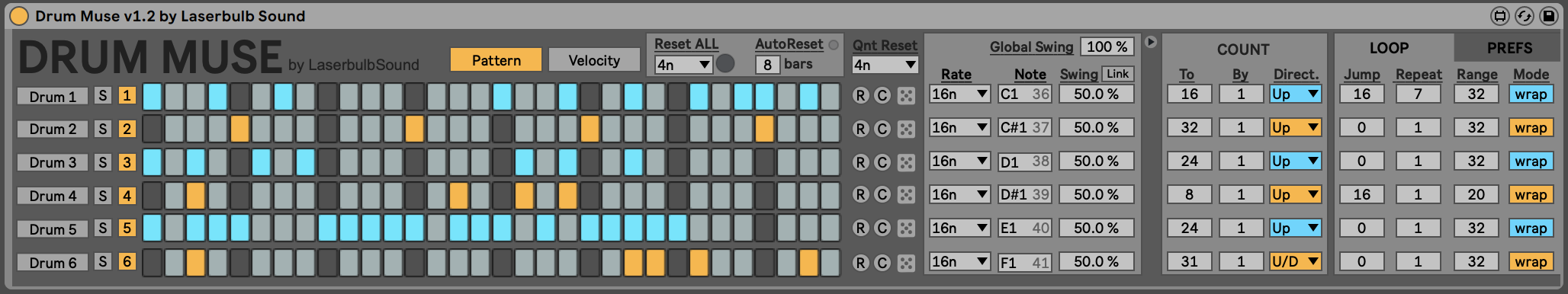 | Description: | Drum Muse is a MIDI drum sequencer that uses an atypical counting mechanism allowing it to move through the steps of its sequences in unusual ways. It features six sequencer tracks, each with individual length, rate, and loop settings ideal for making long, evolving, poly-rhythmic patterns. Each track uses a preliminary counting loop to step through its sequence in variable increments forward, backward, or back and forth. This loop can then be set to "jump" forward a number of steps after a selectable number of repetitions. Version 1.1- Fixed inconsistent syncing with Live's Transport, freezing tracks works as well now. Version 1.2- - Added "Dice" buttons for each track to randomize the step grid. - Added "Randomize" and "Reset" buttons on the Velocity tab of each track to randomize velocity sliders independent of step grid. - New "Link" button in swing section so that the swing amount for all six tracks can be adjusted simultaneously. Version 1.21- Fixed bug where the Dice icon for Drum 6 step grid was randomizing drum 5's steps. Features: - Six velocity capable sequence lanes. -Each track has independent randomize buttons for the step grid and velocity sliders. - Per-track pattern/loop length and rate settings - Solo and mutes for each track - Individual and entire pattern quantized reset buttons -"Auto Reset" to force all six sequencers back to step 1 after a selectable number of bars -Individual swing amounts for all six tracks that can be scaled globally. -Midi transpose mode allows midi input to transpose all six tracks for use as a melodic sequencer -Midi thru mode allows clip or controller midi to be merged with the Drum Muse output -20 recallable preset patterns per instance -All features, other than step grid and preset buttons, automatable and midi mappable. (Hoping to make the grid and presets mappable in future versions) Thanks to Gregory Taylor and his book "Step by Step - Adventures in Sequencing with Max/MSP." I used one of his lessons as a starting point for this device. |