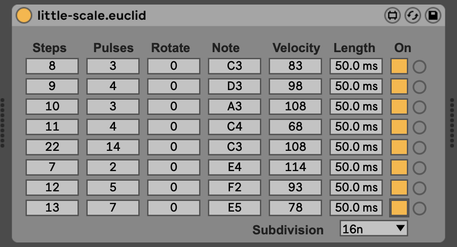 Description: A simple eight voice Euclidean sequencer. All-in-one AMXD file, no need for JS files or extra patches. Feel free to modify!