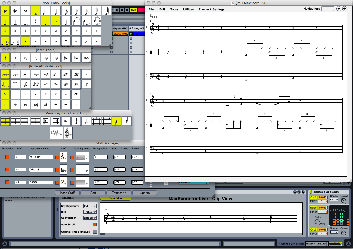 LiveScore.Editor which is the actual music editor. The LiveScore.Editor device has a graphical user interface that offers a number of convenient tools; among them: intelligent transcription with key and clef finder, a percussion map, a set of menus and palettes for easy navigation and interactive editing as well as microtonal notation and playback via the LiveScore sampler.