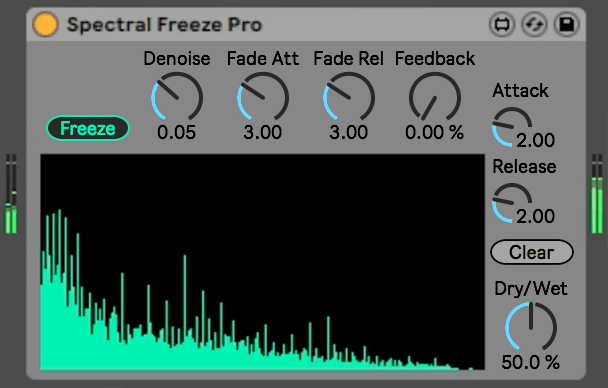 | Description: | Spectral Freeze Pro is dedicated to live audio freeze. Controls include Fade Attack and Release (fade from a frozen sound to the next), Denoise (spectral gate), Feedback (freeze several successive notes to turn them into a chord), Freeze and Clear buttons, Dry/Wet Mix, and more. Video: https://www.youtube.com/watch?v=Zr1MAuum1bQ This audio freeze device is built on a phase vocoder with stochastic re-synthesis. CPU load is low. Parameters are available for automation and MIDI mapping. Open-source license: GNU GPL v3.0-or-later https://www.jeanfrancoischarles.com/2020/02/max-for-live-spectral-freeze-pro.html |