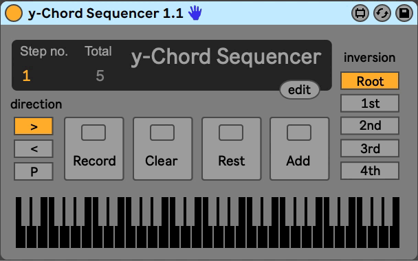 | Description: | The y-Chord Sequencer is similar to the SH-101 sequencer, except it sequences chords of any number of notes. Its similar to the JX3P sequencer. Press "Record", play a chord you like into the device and hold it, then press "Add" to write the chord to a step, find another chord, press "add" again and so on until you have built a sequence. Press "Rest" to add a rest. Press "Record" again to re-enter play mode. The sequence can then be advanced by one step each time a midi note is received. the sequence will also be transposed, where C3 is zero transposition. Unlike many chord sequencers the y-Chord Sequencer can play more than one chord at a time, and won't send a note off until all chords which use that note are released. You can add more notes to the sequence by pressing "Record" again, or press "Clear"and you can start over again. You can play the sequence forwards , backward, or back and forth. If you press edit you can edit the notes in each step numerically. There is also the option of playing your chords as a 1st, 2nd, 3rd or 4th inversion, which produces related harmonic sequences. The device will start from the first step in the sequence when Live's transport is started. The sequence of chords is saved with the device, so it will be loaded with your song, or can be saved as a preset. |