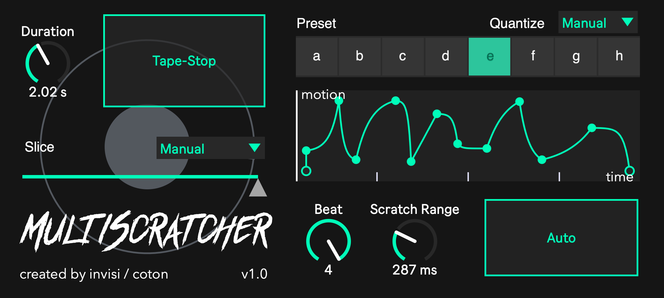 I just bought this device for a sound design project. It's a really cool idea but far from being a usable device yet - here's my experience so far... basically it's very hard to get it to sound like a legit record scratch or time it to the beat so that it sounds musical like what you'd do if you were DJing. The presets don't sound like anything. My biggest problem was not knowing how to trigger the "scratching" manually. The only way I could figure it out was by putting it on auto, which basically randomly selects from the 8 presets, or by selecting a preset manually which would then trigger the "scratch" to play through once. This is not Midi-able so you can't trigger with a simple midi command, and there's no button to activate the scratch in the device itself. The tape stop is cool and works well, but also sounds very linear as opposed to logarithmic. Oh the BIGGEST problem I had was when I deleted the device and reloaded it I could not get it to pass audio until I restarted Ableton... THAT was very annoying, however when I did it again and then started just mashing around in the plugin something I did got it to pass audio again so I have no idea what that was about. All in all really would love this as a sound designing effect but I think it needs a solid round of beta testing so people can give some feedback. I kinda wish I hadn't spend the $12 bucks but hopefully the next version will be robust and I'd still love to use it.