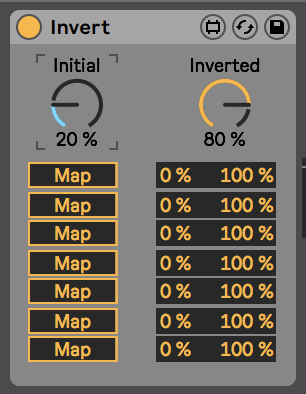 | Description: | Map the output of an LFO or other modulation source to the left dial, get the inverted values out the right. I do this all the time in Max and found myself missing it in Live. Inverting an envelope follower and mapping the output to track volume creates a very crude/dramatic compression effect, for example. |