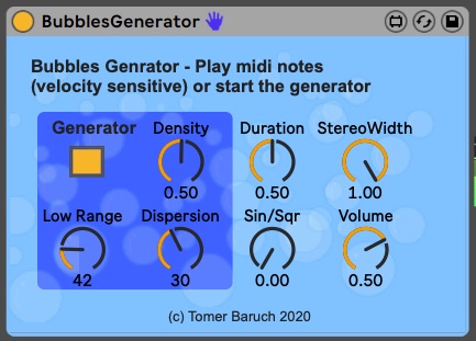 | Description: | Play single bubbles using MIDI or generate a randomised bubbly environment with control over duration, timbre, density and range. |
