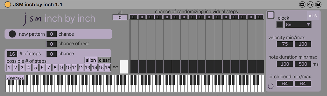 | Description: | Inch by Inch is a generative step sequencer that creates gradually evolving patterns with probabilities for changing individual steps and other parameters. |