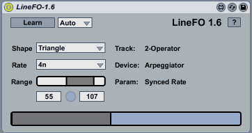 | Description: | This device is a simulated LFO you can used to modulate device parameters. It's simulated in that it doesn't actually use an oscillator at all but the Max line object to simulate shapes an LFO might generate. I built it to see if using this method would have a much lower performance impact than using actual oscillators. I sometimes have 10+ things being modulated by an LFO at once in some of my work and using actual LFOs for that starts to have a serious impact. Using [line] should minimize performance impact yet still give basic ability to modulate things. For extra credit, use LineFO to modulate the ranges of other instances of LineFO. Usage: *Add LineFO to a midi track *Click "Learn".... *Browse to any track and click on a parameter you want it to control *Select the "shape" *Optionally, set speed and range New in 1.6 (*) LineFO now displays what device and parameter it is modulating (saved with Live set too) (*) More accurate timing (found bug in API and created workaround) (*) Fixed bug in max range control (*) Lots of other code cleanup and more detailed help screen |