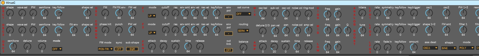 Most of the functionality of the Virus C is implemented, a few things a missing like input, vocoder and multi timbral mode.