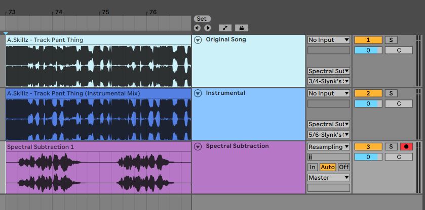Channel 1 will be playing the original song and sending output to 3/4 into the Spectral Subtraction device.