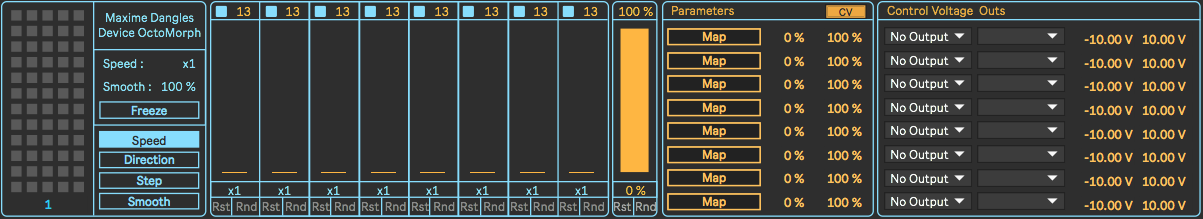 | Description: | OctoMorph is a control patch with 8 Sequenced Sliders. You can see that as a looper for any midi control change. Every sliders have their own Speed, Direction, Number of Steps, and Smooth and they are randomisable too... Push 2 Ready ! and it works great with it :-) Change Log : 2.2 - Reset Button for all Sliders - Saving Presets is now possible - Control Voltage out (modular people will like it very much) - Freeze funtion - It's now possible to stop the sequence of a slider then change the value of each step one by one. - Better Push implemantion (there's still some work to do for this...) 2 initial release Have Fun ! Synth Sequence demo here : https://youtu.be/BYyDD5kUR8s Drums demo here : https://youtu.be/6CSGqd_UOTk |