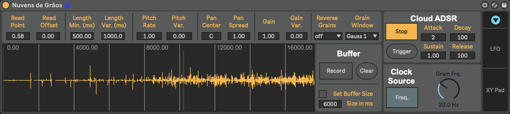 Description: Nuvens de grãos (Clouds of grains) is a Max for Live granulator focused on producing rich textures from pre-recorded or live-recorded audio. It allows for modulation and automation of parameters in order to create constantly evolving textures. Simply drag and drop a sound file into it or record audio from a live input.
