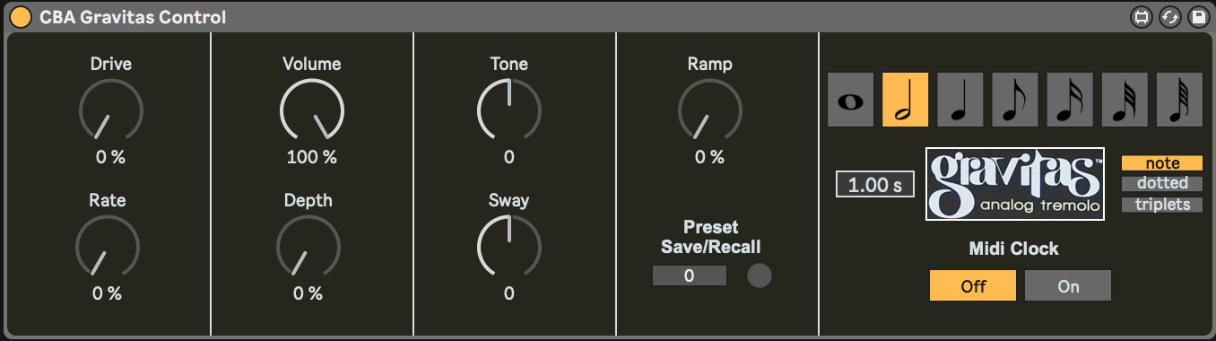 | Description: | I took some ideas from jehrich's "Max Bliss" collection and added new functionalities and a new design. Beyond the normal implementations that can be easily deduced from Gravitas's midi manual, the great advantage that this device brings is the possibility to choose a Live's tempo-based tremolo rate, spanning from the whole note to the sixty-fourth note, including dotted and triplets. A small note for its correct functioning: - The pedal must be categorically on Midi clock OFF. I have left the option to set it to On, but this prevents the possibility of spacing over all the time divisions, since the midi clock "blocks" the pedal on its internal divisions. |