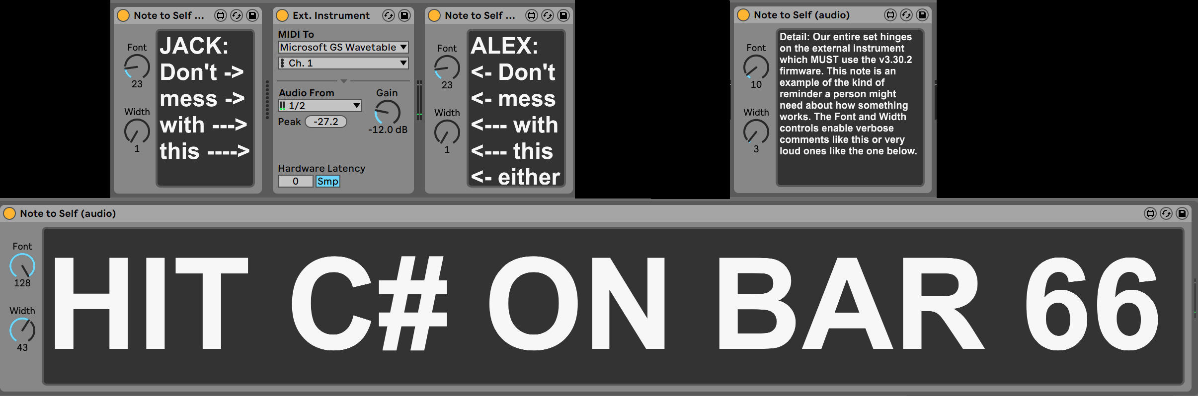 | Description: | Helpful device for leaving yourself (or your collaborators) notes right in the signal chain. Features variable font size and device width for everything from in-depth documentation to loud reminders. Here are a few use-cases, perhaps you've come across a couple? * Write down tips for a device when presets don't quite provide enough information. * Create simple tutorials for students. * Keep a to-do list on each channel in your template so your process stays consistent * Remind yourself what button to hit at an important moment in your live set * Remember the URL where you learned a cool trick for Glue Compressor * Make sure your collaborator doesn't change the EQ on the snare again * Document your a-ha moments during vocal practice, right in your practice session And probably a zillion others. It's quite literally a blank slate! Audio and MIDI versions available, see link - and if you like it, feel free to star the repo! |