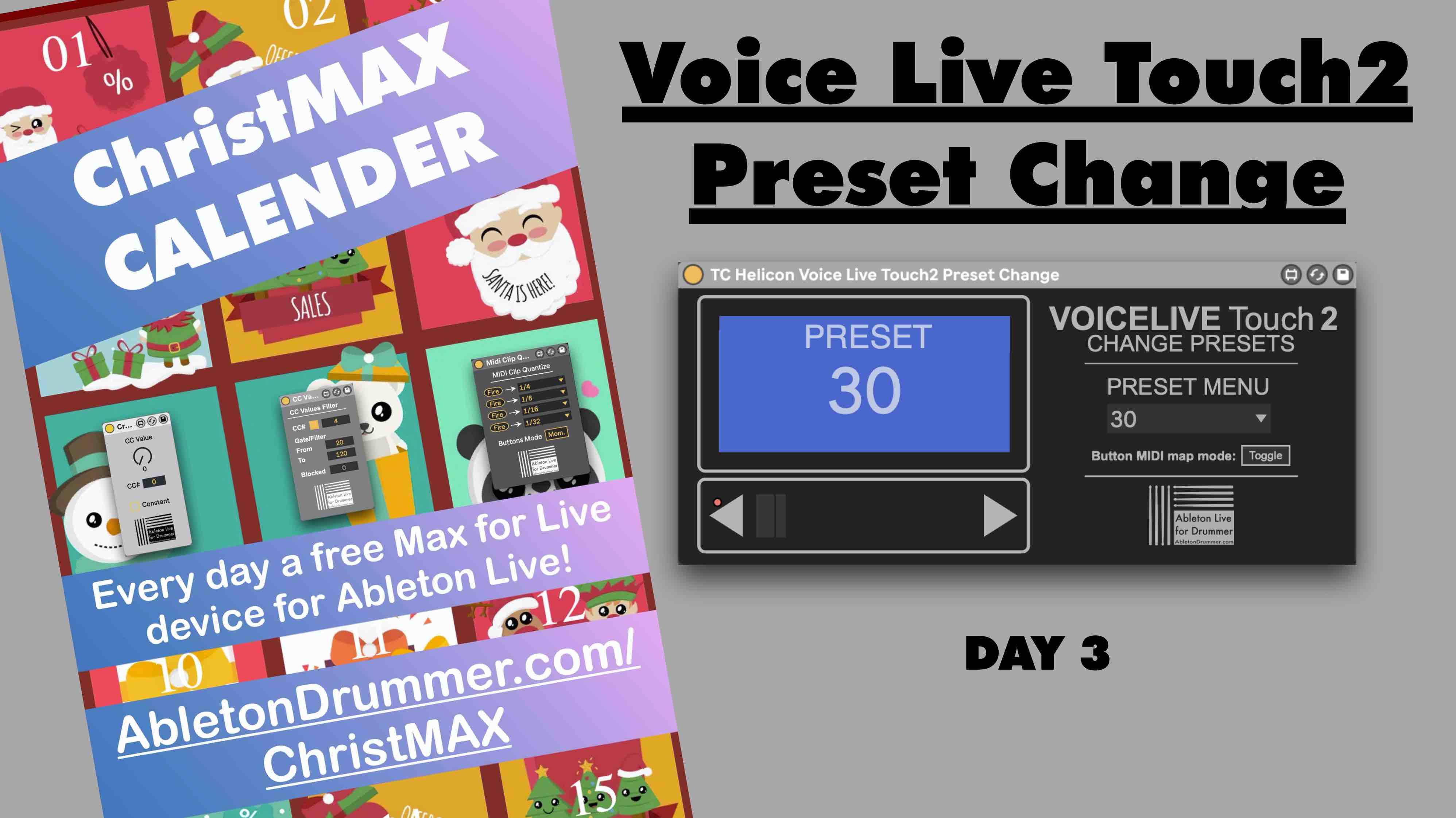 | Description: | VOICE LIVE TOUCH2 PRESET CHANGE This Max for Live device lets you control preset changes of your TC Helicon Voice Live Touch 2 via Ableton Live. You can automate changes (e.g. selecting automatically the right preset when going into the chorus) and you can as well set-up an external MIDI controller to manually change presets. Note: This Max for Live device only SENDS changes TO the VL-Touch2. Check out more devices here: https://blog.abletondrummer.com/free-max-for-live-devices/ |