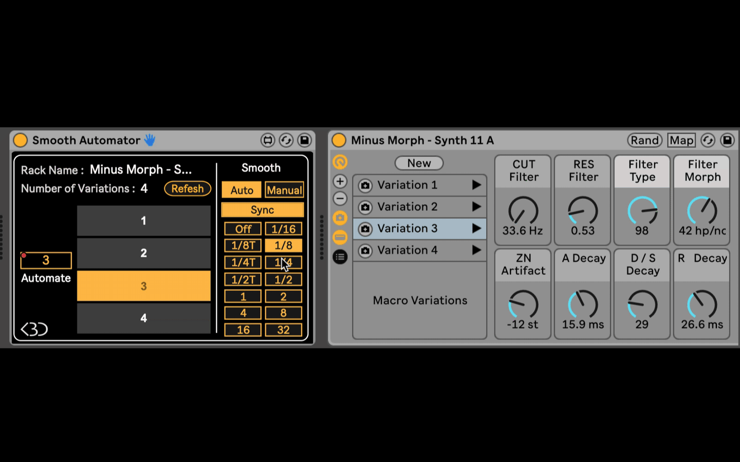 | Description: | Allows to create automations and morphing for Live 11's Variations. Simply put it left of an Instrument Rack, or MIDI Effect Rack (Audio Effect Rack version also included in the download). If you encounter problems with the device (macros jumping or misbehaving), simply do a "Hotswap" on the device and replace it with itself, that should fix it. When re-opening a set the devices should work correctly. |