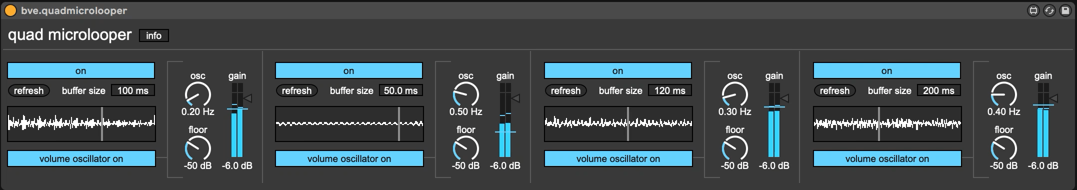 | Description: | bve.quadmicrolooper is an intuitive looping utility which holds 4 loopers with tiny buffer sizes (20ms to 500ms). each looper unit has its own gain oscillator with oscillator speed and floor controls. → use the quadmicrolooper as a stutter effect or stack several loops on top of one another to create fascinating soundscapes. |