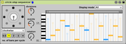 Description: Two 'circle sequencers' based on work done by Wouter Hisschemöller (http://www.hisschemoller.com) that use Euclidean rhythms to generate MIDI data. The first sends a single MIDI note whenever the dial hits one of the event points, while the second steps through a sequence.