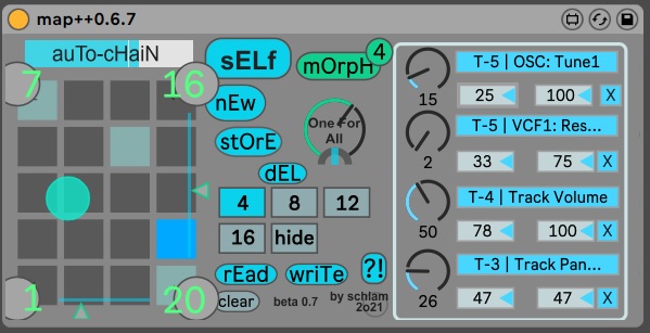 | Description: | Hello. binding, mapping, morphing, preseting, this device tries to be a little (and I hope useful) swiss knife. This device allows you to store and recall differents mapping configurations in your live.set. Each live parameter can be mapped differently and by differents controllers or other devices in the same live.set Usually with devices that handle mappings settings, the parameter which is mapped becomes greyed and you can do nothing with it except moving it with your controller or another device, and, above all, even when the device controlling the parameter is switched off, the parameter is not released/unleached... ...not here. With mapper mAp++, all the binded parameters are released when the device is off. And, above all, everything is re-binded when it's switched on again. it's the same for each preset of the device. In preset one, you can have a parameter, and having it too in the preset 2 but with differents settings. You can on the fly change all the mapping settings and automate these changes very quickly. You can automate the way that the changes change =) Feat: - From 4 to 16 parameters with Min and Max values can be controlled by the device (but you can use as many devices as you want) - Each mapped parameter can be controlled by an external controller (map the corresponding dial with the Live MIDI mapping setting system) or by another mapping device (trying to map some parameters of mAp++ with the LFO Midi is often funny. And you can, in return, control parameters of the same LFO which is controlling the device, which is controlling the LFO etc...=) - A big dial allows to control the 16 others parameters in the same time. It's mappable too. When it's automatized or mapped, the 16 others ones can still be used, the informations are both sent. ->it allows to move a situation within the cloud of other situations which surrounds it.. - Multimap -> this device can be used as a multimap 16 device. - An auTo-mAp slider can be assigned with what you want to switch from one preset to another. If you have 4 presets this slider will have 4 positions, if you have 10, it will have 10 positions. It's very useful when you assign it to an hardware knob or slider, the stroke of the knob is always fully used. In addition to that. All the stroke is used even if your presets are not adjacents. - The track of the controlled parameter is seen in the map button! Very often with this kind of device, only the name of the parameter is written in the Map Button. But "Track Volume" is not very understandable when you have 24 tracks... Here, each button shows the track where the controlled parameter is (Usual Track / Return tracks/ Master Track) - 6 modes to control the presets: Sefl-sufficient / Track / Scene / Chain selector / 2 presets morph /4 mode with id change - 20 presets in the same time per device - New / Store / Del / Clear buttons for touchscreens. - read / write to store/recall presets file configuration (.json or .xml) Hope you will find this device useful. It's a beta release... Cheers Julien ----------------------------------------------SETUP A)- click "New" or shift+click an empty preset slot - click on one of the 16 "Map" buttons. It will blink. - click a mappable parameter in your live set. - choose a minimum and maximum values. - do the same with others "Map" buttons. - press "stOrE" or shift+click on the preset slot you choosen B) -repeat step A with another preset slots C) -You can save this setting with the Write button - the id of mappable parameters change from one live.set to another so, name your file with the name of the live.set you used when you created it, to avoid issues. -------------------------UPDATE 0.7.3 - minor bugs. - live 11 compatibility for the 'chain-selector' mode. the device monitor the live version at startup. The same version should work either in Live 10 and 11. -->chain selector mode is working good if you toggle this mode once the device is in a chain. If you group the device by a right click on it and the 'chain" mode is already selected you will have to select another mode and then select "Chain" mode again. ------------------UPDATE 0.7 ...................A° addition of a Morphing Mode............. This device was so close to a morphing preset device that the functionality has been added. -click the map/morph button to enter this mode. The preseter change to a node object. - you can choose to morph between 2, 3 or 4 presets. -> easy mapping of the 4 presets to morph. -->simply click one of the round buttons and select an already saved preset slot. ->you can automate or map the morphing with the X and Y sliders. ->if you like a "step" of the interpolation, just store it as a new preset. -->the presets can be morphs in several ways : with or without the recall of the "id" of each preset. ----->"id" can only be recalled during morphing with the "2 preset morph mode". (it's due to a limitation of Max : impossible to apply 'threshold 0.5' to the interpolation of a parameter during the recall multi interpolation. It's only working with a regular interpolationj between two presets.) ->click the "id" button which appears in the 'morph 2' mode. There is now two modes. ..in map mode. only the mapping settings are recalled aka the id of each binding. The dial of the 16 mapping buttons are not recalled (but they are saved anyway) ..in morph mode. the dial value of each parameter is recalled and morph. there is 2 sub-mode : - a 4 preset morph mode (dials morphed but id mapping untouched) -a 2 presets morph mode (dials morphed but possibility to change id's mapping during the morph) .....................B° ................................The BiG DiaL. .The big Dial has been improved. .Anytime, you can move it to move all the parameters of a preset by a very tiny adjustment or a big one. another little dial, hidden at the bottom of the big dial allows to scale the modulation of the Big Dial. When you release the Big Dial, everything comeback to