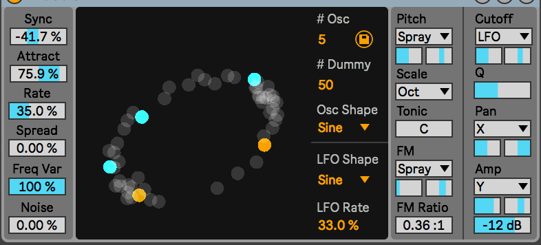 | Description: | FREE FREE FREE device! Swarmalators applies the "Swarmalators" model to a bank of oscillators as modulation. More info is in the link below about Swarmalators. Because Swarmalaotrs' positions and internal oscillators are all interconnected, they offer different dynamic possibilities from swarming to harmonic synchronization. The internal oscillators of each Swarmalator is applied to basic LFO shapes, which together with the XY positions can be mapped to the audio oscillator parameters. The audio oscillators additionally have tuning options (Scala files can be used for custom tunings, including microtonal ones!), FM, and resonant lopass filtering. This allows for sonic possibilities from lush textures, to glitchy and harsh soundscapes, as well as generative melodic and harmonic patterns. Demo: https://www.youtube.com/watch?v=YwFQIbTzgpw Walkthrough: https://youtu.be/lq0JKNig37s More info about Swarmalators: https://www.complexity-explorables.org/explorables/swarmalators/ TO INSTALL: Make sure no extra subfolders were created during unzipping/extraction and then drop the "Swarmalators T" folder here in Ableton/user library/presets/instruments/max instruments Make sure you have the latest version of Live 10 and Max! More: dillonbastan.com Issues/etc: dillonbastan@gmail.com |