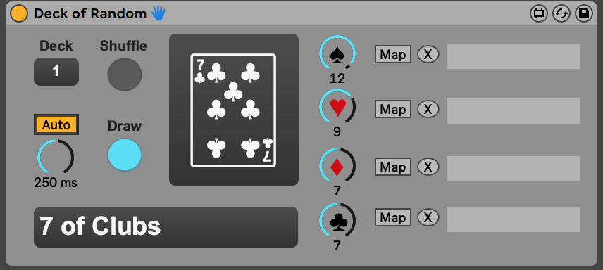| Description: | Deck of Random (2020) is a Max for Live 4x random source that uses a virtual deck of playing cards to generate its randomness. Each suit can be mapped to any parameter in Ableton Live, and when a card is drawn from the deck, that suit’s value changes to the number value of that card (1-13). In this way, four different random sources are constantly effecting the probability of each other. Cards can be manually or automatically drawn at a set interval. The deck will automatically reshuffle after the last card is drawn, or can be reshuffled at any time. |