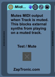 | Description: | DO NOT USE THIS DEVICE, use my "Zaps External Synth Tools" instead, it does this, and a lot more :) https://maxforlive.com/library/device/7315/zaps-external-synth-tool This does one, very simple thing. You put it in a MIDI chain, and it will stop passing MIDI data through when the track it is on gets muted (or when it's "Test/Mute" button is pushed). Why would you need this? Live treats track "mute" as muting the *audio*, not stopping the MIDI. The actual synth's continue to play, creating note tails and other things that will pop in when you unmute. Also, if those are *external* synths, mixed down on an external mixer and arriving in Live on a separate input, they will keep playing. Just plug this device onto the track, and now the "mute" button on the track will block the MIDI data flow and make "mute" behave accordingly. This is great for live "DJ Style" sets driving real-world synths from LIVE using a control surface. (I use an APC40mkII to run a bunch of analog gear) |