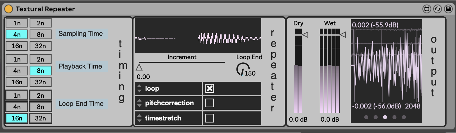 | Description: | Textural Repeater is an audio looping device that constantly samples incoming audio, and plays it back in various speeds, directions, and with optional multichannel processing and pitch correction. It is ideal for rhythmic transformation of percussive and tonal sources. |