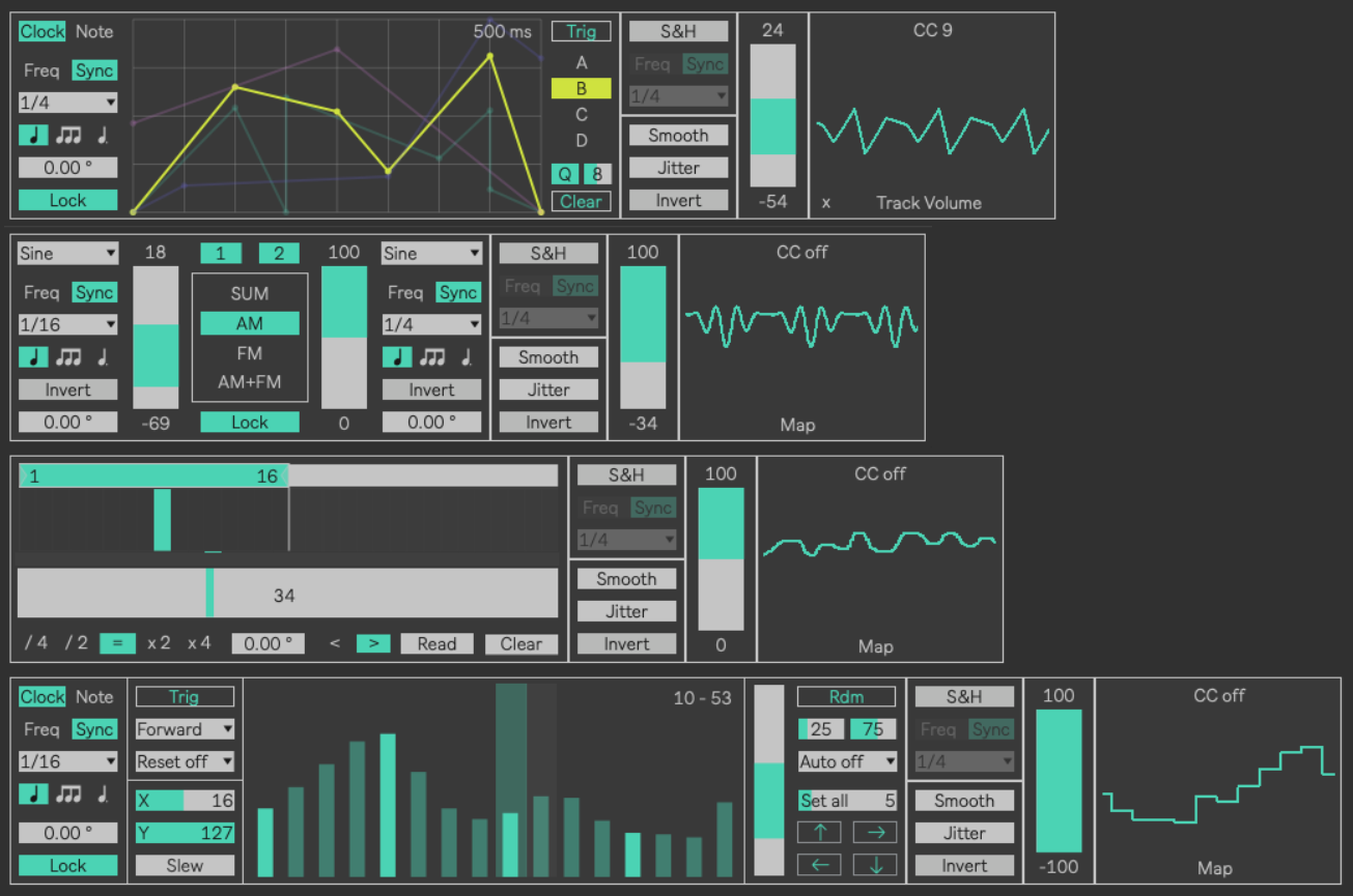 | Description: | Pack of 4 essential MIDI modulation devices. - Dual crossed LFO - Step modulator - Multi stages function generator - Modulation recorder/player Each modulator output can be mapped to a parameter and/or sent to the selected CC. |