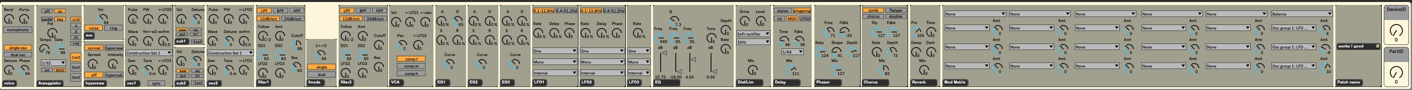 | Description: | UPDATED: now supports pulling the current patch from Kyra! Be careful though, make sure only one Kyra Controller is monitoring MIDI in when you press the button, because Kyra doesn't target patch transmit messages to a part. This Max4Live device translates between Kyra's SysEx parameter change messages and Ableton Live, so you get a (very wide) one-control-per-parameter ability to automate all eight parts in real time, and the ability to record automation by twisting knobs on Kyra. Note that you need to set the SysEx ID to match your Kyra's configuration, and the Part ID to match the part you want the controls to edit (i.e. if you have 8 Kyra parts in your Live set, you need to have the Kyra Controller on each of those MIDI tracks, with the Part ID set appropriately on each). Parameter values save with your Live set. You can even just type in a new patch name! Because I'm never using Kyra's interface to name a patch ever again. I hope others find this as fun and useful as I do. Let me know if there's something else you'd like to see it do! |
