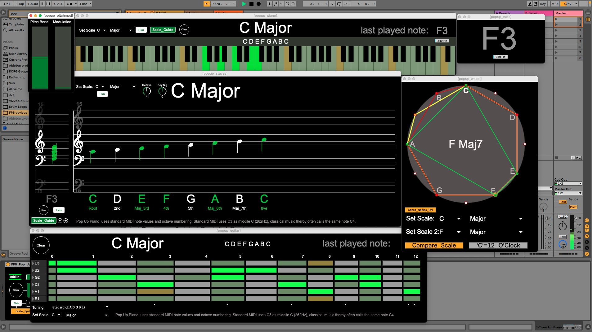 | Description: | Pop Up Piano Version 3.1 Requires : Ableton 11 / Max for Live 8 / Bach Externals Updated for Live 11 and M series Macs Pop Up Piano 3.4 is a Max for Live device that comprises a number of floating windows that visualise MIDI input with scale guides in a manner that is useful for teaching and learning about music. New inversion 3.4: Updated to include all of Lives native scales, Automatically links to Push selected scales, compatible with M processor Macs, improved under the hood for better processor performance Available for free at https://fingerspushbuttons.gumroad.com/ |