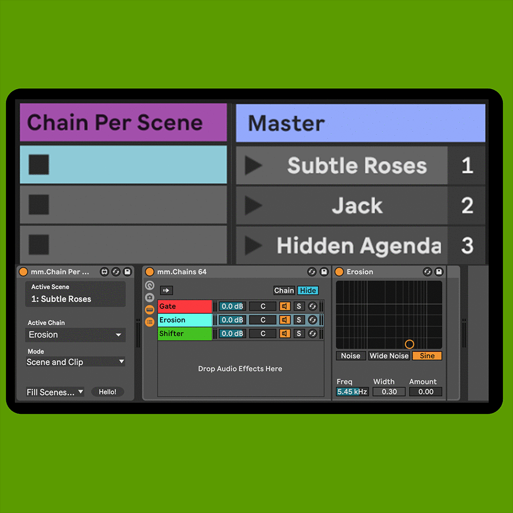 | Description: | Simplify your Live set by linking an audio effect or instrument chain to each scene in your set Features -Selects and routes audio through any chain by simply launching or selecting scenes or clips -Automatically selects and shows the active chain for easy editing -Saves CPU by turning off all instruments and effects except those in the active chain -Well documented max patch to show how it all works -30 day money back guarantee -Fast email support at messinkimusic@gmail.com You Will Get Two Max for Live devices, one that controls audio effect racks, and one that controls instrument racks 8 rack presets that are setup to work with the devices. They are fully customisable and simply work as a template that will save you time setting up Demo Live set that walks you through all of the features UPDATES 29/06/2021 Version 2.1.1 All buttons are now hidden from Live's mapping system 29/06/2021 Version 2.1 Fixed a bug that stopped the chain selector from moving in certain situations |