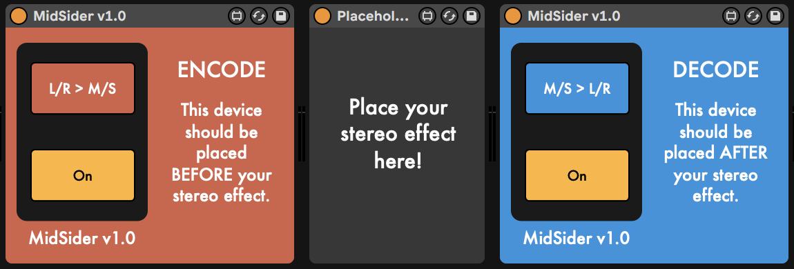 | Description: | Ever wanted to use your left/right stereo effects to process in mid/side instead? WELL NOW YOU CAN!!11!!! MidSider is a device that converts your stereo signal from left/right format into mid/side or vice versa (depending on mode). The device has two modes - encode (red) and decode (blue). After the encoder (red), the "left" channel will now contain the "mid" information, while the "right" channel will contain the "side" information. Place your favourite stereo effect after the encoder to process in mid/side. Remember to place the decoder (blue) after all processing is complete to convert the signal back to left/right in order for the stereo signal to be played back correctly. TLDR: put the RED device before your stereo effect and the BLUE device after. Left controls now affect "mid" signal and right controls affect "side" signal. Follow me on IG @nyftymusic |