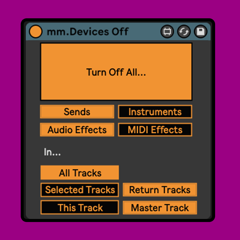 | Description: | One mappable button to turn off and on any combination of: audio effects midi effects instrument devices sends in either: the selected track(s) the track the device is placed on all tracks UPDATES 11/05/2022 Version 2.0 Completely rewritten and with new features: Only turns back on devices that were on in the first place. Works with sends, turning them down to 0, and then back to their original state. Has option to turn off devices and sends in the selected track(s). Place the device on the master, map it to a key and then quickly toggle devices and sends in the selected track. 11/1/2021 Version 1.2.1 If you have multiple mm.Device Offs in the set, they will not turn eachother off. Also improved the switching when selecting which tracks you want to turn off effects in. 19/12/2021 Version 1.2.0 Turn On and Off buttons are now mappable 25/09/2021 Version 1.1.0 Added ability to turn off effects on the track that the device is on 20/08/2021 Version 1.0.1 Fixed bug that stopped the device working with MIDI effects |