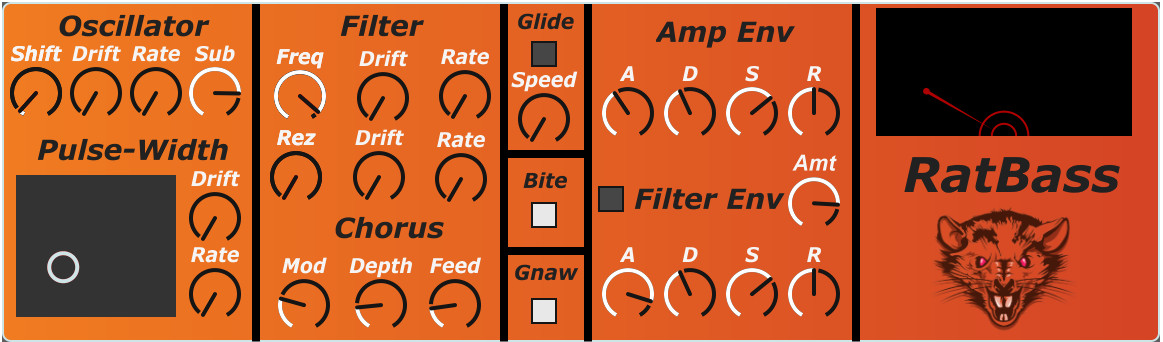 | Description: | RatBass is a nasty little pulsewave synth with a few features that make it unique. The oscillator detune, pulse-widths, filter frequency and filter resonance controls all have controllable analog-style drift, and there are two super ugly distortion controls, Bite and Gnaw, that obscenely mangle the sound. RatBass uses a zero-delay feedback transistor ladder filter model assembled in Gen by Oli Larkin, which contains code from Teemu Voipio. Be sure you keep the included gendsp file in the same folder as the amxd file. |
