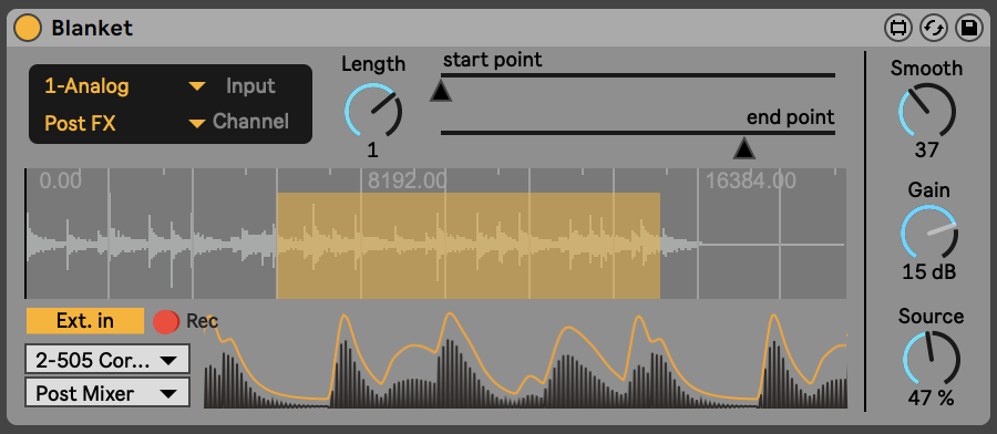 | Description: | %%%%%%%%%%%%%%%%%% ** Only works with Live 11 ** Consider buying: if you like my work and effort, you can support me and consider buying it for 4$ or more by following the link below. This will help me to make and share more of these devices! https://igotlost.gumroad.com/l/Blanket %%%%%%%%%%%%%%%%%% Youtube demo: https://www.youtube.com/watch?v=DTeu3j1tI5E %%%%%%%%%%%%%%%%%% Every sound, silence included, has an amplitude envelope. For some sounds, the amplitude envelope is so peculiar to be the main feature we use to identify it. Think of the many forms of white noise sounds, the rain, the sea, walking, etc...; they have more or less the same frequency spectrum, but we access their identity through how their amplitude progresses in time. However, digital technologies can allow us to isolate even the most hard-wired amplitude envelope and assign it to another sound. The 'blanket' has been born for this purpose. Put it after an instrument or sound, and drop a sample in it. Now specify a MIDI source and select a part of the sample. Finally, trigger some MIDI notes. You will notice that the input sound will receive the exact amplitude envelope of the selected portion of the sample. Alternatively, the Blanket can listen to an external signal and use its envelope to modulate the amplitude of its main input. In order to activate the external signal, first, specify the input source in the drop-down menu beneath the "Ext. In" tag. Now press on the "Ext. In" button, which will turn yellow. This action will bypass the sample stored in the buffer. If you want to switch back to the "sample mode", just press again the "Ext. In" button, which will turn grey. Finally, external inputs can be also recorded to the sample buffer. Once an "Ext. in" source is present, hit the record button. You can specify the length of the recording according to the general Live transport. The 'crystallized' amplitude envelope can be amplified and smoothed. Finally, the sample can still be mixed with the input, enveloped signal. What has been formed is a new relationship between two however independent sounds. %%%%%%%%%%%%%%%%%% This device is frequently updated. Updates will overwrite the previous version. Here is the list of modifications, which are implemented in the current downloadable version: - 29/11/2021: Now the enveloped signal out is in stereo - 05/11/2021: Major update: it is now possible to route an external input to the Blanket, and use that input as the envelope generator. It is also possible to record the external input to the buffer. % |