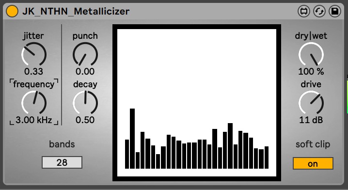 | Description: | Make any sound metallic, created with JK (@ancientjpeg on twitter) Use Metallicizer to create punchy and futuristic percussion: from hollow wood to piercing metal. The core of the plugin relies on two main modules: a vocoder, and a Karplus-Strong resonator. The vocoder bandpass filters are set to an extremely high Q, which creates a resonance in each band that lends an impressively realistic tonal quality to any content passed through. As the Q factor increases, so does the "decay" of these resonant filters. This is enhanced by the Karplus-Strong module, which simply functions as a short-time high-feedback delay with a lowpass filter in the middle of the feedback circuit. To round things out, transient shaping and distortion give your percussion some additional thickness. |