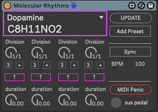 | Description: | Have you ever wondered what molecules sound like? Molecular Rhythms is a Max for live device that takes molecular formulas and turns them into polyrhythmic sequences! It does this by taking the number of atoms within their formula and using those numbers to run a multipart arpeggiator! Say you want to hear what Dopamine sounds like. You can input the chemical formula (C8H11NO2), and from there you can select a midi instrument, drum rack or any other midi device you'd like to control, Select a subdivision and play away! When notes are depressed on a keyboard the first note pressed (in the case of Dopamine) will play a sequence in 8 then the following note played will be in 11 and the third note will play in a sequence of 2. This can be done with any molecule inputed into Molecular Rhythms! Give it a try! The possibilities are endless! *Ableton Live and Max For Live are required. Programmed by Doug Hirlinger. |