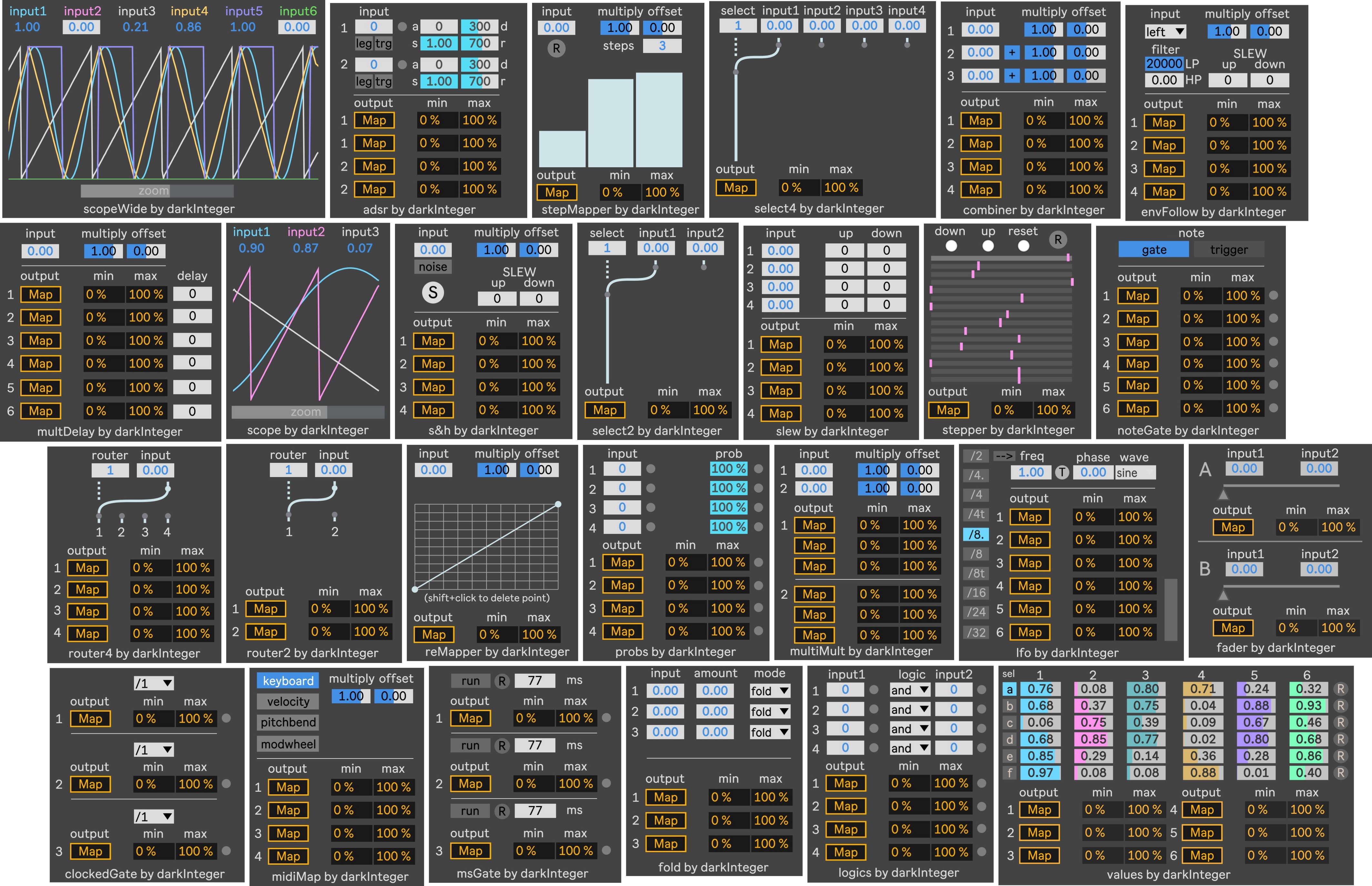 | Description: | You can use these devices for modulating parameters inside Ableton Live. These devices has outputs for modulating parameters but has inputs too to receive modulation signals from other devices, this opens up new possibilities to build your own modulation system. Devices /in alphabetical order/: adsr /audio & midi device/ clockedGate /audio & midi device/ combiner /audio & midi device/ envFollower /audio device/ fader /audio & midi device/ fold /audio & midi device/ lfo /audio & midi device/ logics /audio & midi device/ midiMap /midi device/ msGate /audio & midi device/ multDelay /audio & midi device/ multiMult /audio & midi device/ noteGate /midi device/ probs /audio & midi device/ reMapper /audio & midi device/ router2 /audio & midi device/ router4 /audio & midi device/ s&h /audio & midi device/ scope /audio & midi device/ scopeWide /audio & midi device/ select2 /audio & midi device/ select4 /audio & midi device/ slew /audio & midi device/ stepMapper /audio & midi device/ stepper /audio & midi device/ values /audio & midi device/ User manual: https://drive.google.com/file/d/1MPjKIHbp4jr_ENEfTF6jxPS1mXut5lFp/view?usp=sharing |