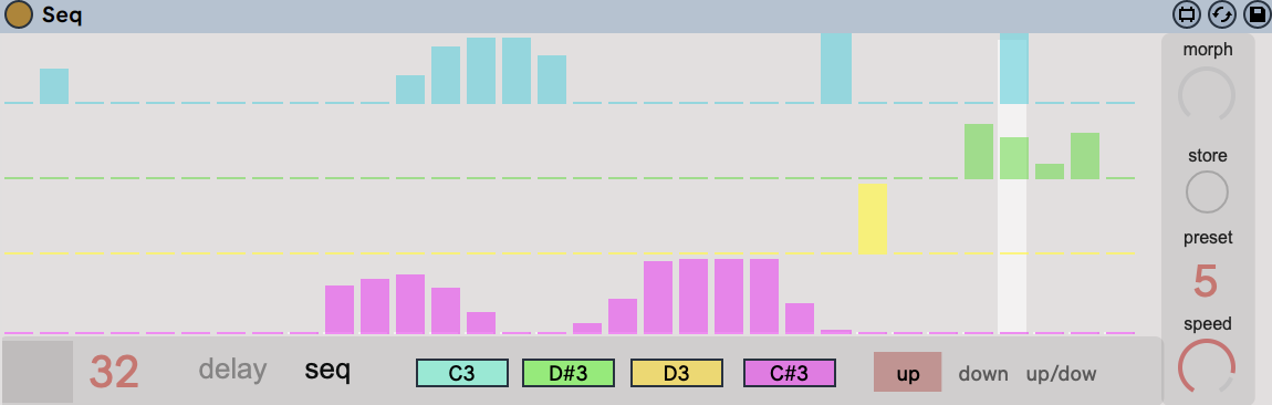 | Description: | Seq is a four voices sequencer largely inspired by the work of Joshua Eustis from Telefon Tel Aviv. You can manipulate timing, store and morph patterns, edit velocity... feel free to edit it and improve it =) |