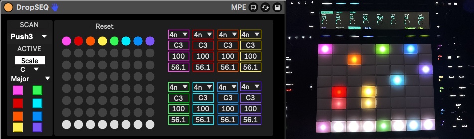 | Description: | 1.5 Added checks for switching in and out of session mode on Push, renamed a few things. By default it should be ready for Push3 after loading so pressing shift/select at the same time should Grab control of the device. 1.4 bug fix, should now correctly save with the live set. 1.3- Should now work with Push3 Standalone. I don't own one to test on but everything is controllable fully from the controller version so it should work to the best of my knowledge. Once loaded there's a setup page that should be self explanatory, on the right side are "resync" and "active" switches, above the switch is a reminder of what buttons on Push controls this so you don't have to constantly navigate to this page. Thanks to Isotonik Studios for some examples on using Push3 standalone, surely you know who that is but if not check them out! 1.2 -Works with Push 2 and 3 -Changed the Scale system to work better with Live 12, instead of Chromatic it can now just be turned off by clicking Scale. -On off buttons on Push now reflect the same buttons on the device. -Changing tracks in Live will release Push control and keep the Active setting when the track is reselected. issue- Active occasionally needs to be pressed more than once for the device to be displayed on Push. DropSEQ is an 8 Lane sequencer where each lane has an independent Rate, Note, Velocity and Duration. It's meant to be played from a Push2 but can also be used standalone, it just loses some of the playability. Each lane has a start point chosen by either the onscreen grid or Push2 button matrix. When it hits the bottom white strip the note is played. It can be placed while running or stopped. If placed while running it will overwrite the countdown happening and start the countdown over from the new start point. Global transport controls whether the sequences are playing but they don't restart with the transport, they just continue dropping based on whenever they were placed until either the start point is changed or Reset is pressed. Pressing Reset or the Push2s UpArrow will start each lane over at the current start point at the same time. Each lane can be turned On/Off using the buttons on the left or the Push2s Scene Launch Buttons. When turned off it continues the countdown silently and when turned back on will pickup wherever it would have been if never turned off. It has all of the scales included with Ableton. _Live 11.1_ The scales will stay in sync bidirectionally with a Push2 or midi clip. Except for the scale syncing I believe everything else will work on older versions of Live. I got the basic technique for the Push2 integration form a MusicHackSpace video by Mark Towers, if you're interested in this kind of stuff I highly recommend their courses. If you're using a different grid controller like a launchpad this could be pretty easily modified to work with one of those as well. If you go to do it and my messy patching makes it impossible feel free to hit me up haha Any tips or suggestions are always welcome-Thanks |