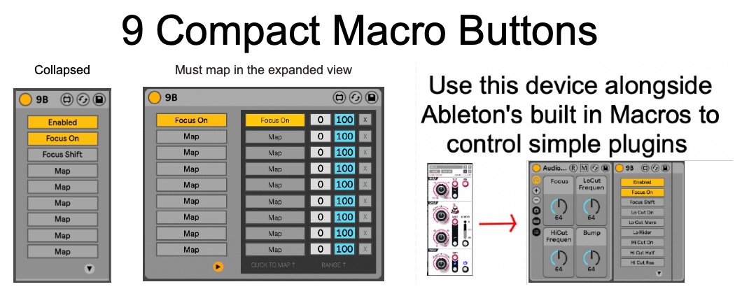 | Description: | These are 9 assignable buttons that can turn things on and off. The buttons can be mapped to a bunch of stuff but I figured I'd give instructions to other beginners like me for assigning it to plugins. Instructions: 1. Create an Audio Effect Rack and put the device and your plugin inside 2. Click the button labeled Map in the device's expanded view 3. Click on a parameter you'd like to control in your Plugins configure view. 4. Use abletons built in macros to control parameters that aren't buttons. 4. Save the rack to re-use. (You can't copy and paste this device, I'm not sure why) As stated before this is based off the One Button device created by surferpikachu. https://maxforlive.com/profile/user/surfingpikachu I tried to improve upon the user interface of the previous device I posted by making it as small as possible. Im leaving the old ones up incase this version is buggy. Im a total novice at M4L so please feel free to improve upon this device and point out bugs. (Im using the trial version of M4L and don't plan on maintaining this device once it expires) Thanks! |