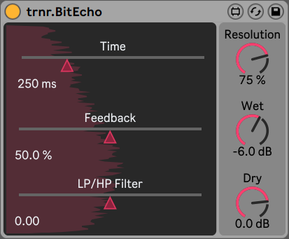 | Description: | BitEcho is an 80s inspired, modeled digital hardware delay with "pristine" 12 bit/33 khz sample resolution and 1 second delay time. The resolution can be brought further down from brittle, digital artifacts to absolute bit crushed mayhem. Inputs and outputs are clipping protected (which means that they can distort - just like a hardware device) and the delay time is gently modulated for subtle variations and stereo widening. The Pro version features a triangle LFO for modulating the delay time, separate controls for bit and sample rate resolution, the ability to sync the delay to the host's tempo and a ping-pong delay option. Changelog: Version 1.02 - Updated resampling algorithm with proper anti-alising - Updated range of the resolution control Version 1.01 - Updated UI: will visually fit better between stock devices and also changes its colors according to the selected theme. Version 1.0 - Initial release |