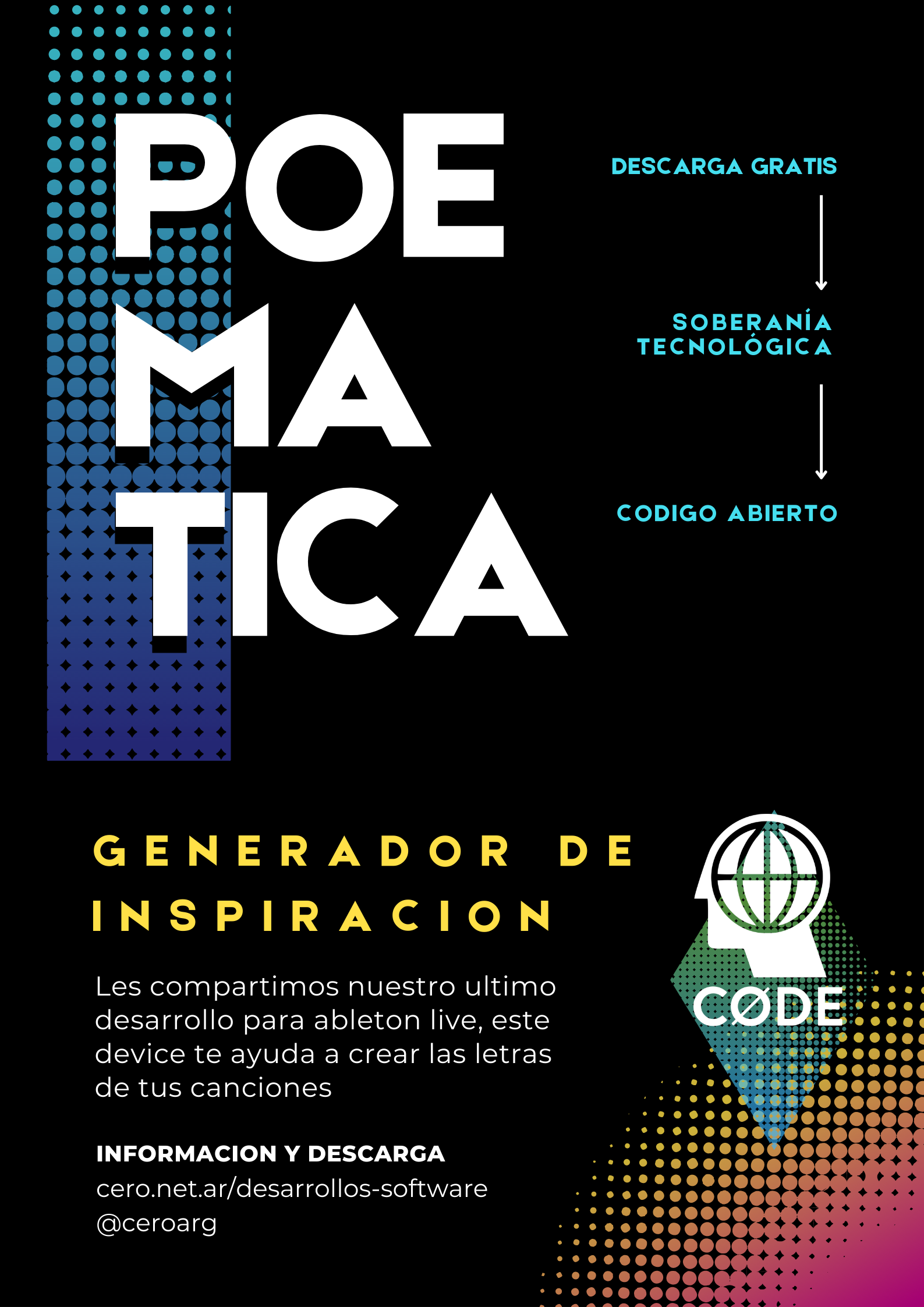 from their instagram: "We share our latest development for Ableton Live, this device helps you create the lyrics of your songs generating poetic phrases. Download is now available on the official website of ableton max4live. More info and download at 🌈 cero.net.ar/desarrollos-software/"