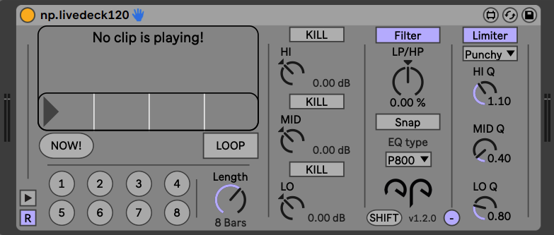 Description: LiveDeck is a M4L audio effect and Live API utility tool that features a three-band EQ, a combo filter (LP/HP), a simple limiter and a looper section that always controls the currently playing warped audio clip on Track in Live’s Session View.
