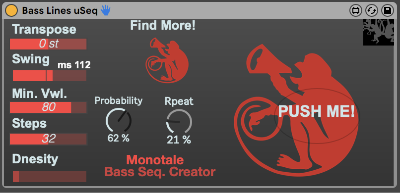 | Description: | Inspored by Skinnerbox Sting but with some modification. A better implementacion off Swing. Achange in the algorith used by SKINERBOX to try to do it not so 303 but to give more space and durations on the notes. Adding a probabilistic dial. Adding a random repeater. Dec. 2022. Promocioal purspose, share the publication on your stories or Feed and Name Monotale Instruments and then we weill send you a copy of the patch. Developed and intervented by Paulo Cominotti @ www.monotale.com.ar See video: https://youtu.be/lYC7SnGjCqY Follow and Share: https://www.instagram.com/monotale_instruments/ |
