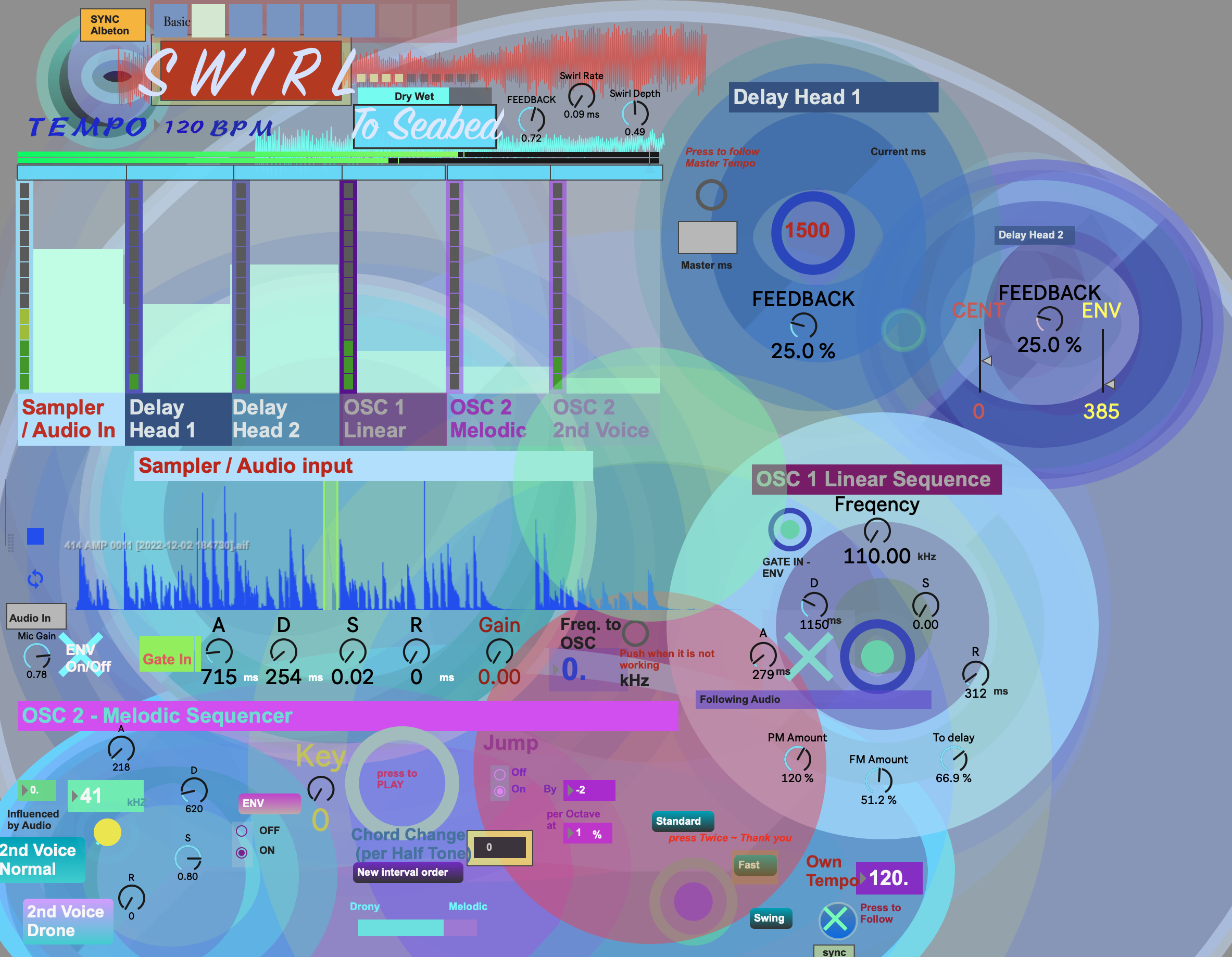 SWIRL TO SEABED is designed as a jamming and play along machine coping with the sprite of generative music and feedback adoption. Most of the common parameters of a synthesiser are absent in it, because the primary idea of its birth is how a musician plays instruments or voice at the lowest controlling a synthesiser. If this is disappointing you, you could try the other patch - the OCEANS which will be uploaded later in which all the controls will be shown in the presentation page.