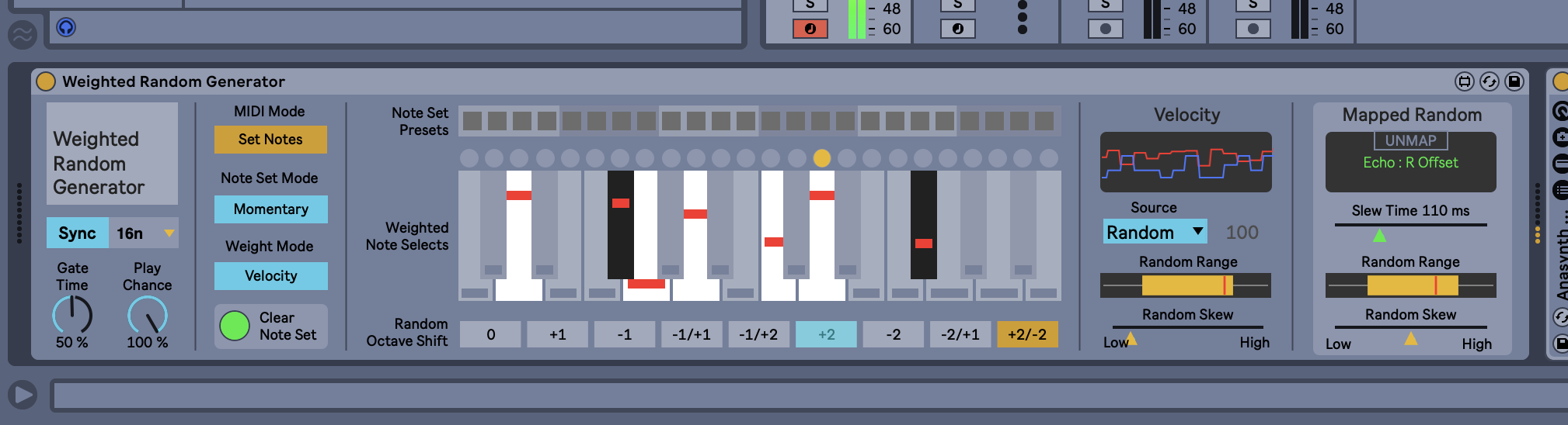 | Description: | Yet another random note generator? Yes, but with an important difference: the random stream of notes is given structure and shape by weighting the probablility a note will be chosen. This means that some notes will be played more often than others and the result is much more musical than a simple stochastic algorithm. Another critical difference in terms of musicality is the random generator is based on a 2-octave set of notes. A 2-octave note selector can better accommodate any key, no need to wrap the scale around and compress it into a single octave. Also, if you're familiar with chord inversions, a 2-octave selector can preserve the inversions you're using. I've designed this device with musicality in mind, it's really well suited to music structured around chords and scales, so, if that's your thing, you'll get a lot out of this device. How it Works The core of the device is the 2-octave graphical note selector. This user interface establishes the "note set" that the random generator draws from. Each note in the set has a "weight" which determines how often the note will be chosen. The weight is shown and set by the slider knob in each key in the keyboard graphic interface. There are two ways to set the notes: manually by clicking on the keyboard graphic interface or using a MIDI keyboard. This is enabled by setting the MIDI mode to "Note Set." Selecting a note manually means clicking on the key and moving the slider to set the note's weight. The higher the slider knob, the more likely the note is to play, relative to the other notes in the set. Keys that are grey are not part of the set and will not be played. If no notes are selected, the generator plays nothing. Setting the Notes Using MIDI or Clips In MIDI Note Set mode, you have two options: "Latch" and "Momentary." In Latch mode, each note played will remain set when the key is released. Hit the same key again, and the note is removed from the set. In Momentary mode, a note is only selected as long as the key is held. Momentary mode also works with a sustain pedal to keep played notes selected as long as the pedal is held. When setting the notes using MIDI, the weight of each note can be determined either by the played velocity or randomly. This is set by the "Weight Mode" switch. In velocity mode, the higher the velocity, the more likely the note will play. The note set can always be modified manually. Clocking the Notes The generator has a clock that is used to trigger the notes in various ways. At the left of the device is the clock module, which has the familiar sync/time switch to determine the time base of the clock. The control to the right of the time base selector is clicked to set the specific timing of the clock. Below that on the left is the gate time. The gate time is set as a percentage of the clock period, which means that you can change the clock period and the gate time will change with it. Next to that is the "Play Chance" control which sets the likelihood that a note will play or skip the clock. Managing Velocity To the right of the Note Set selector is the Velocity section, which configures how the velocity of a generated note is determined. There are 3 modes there: "Fixed" which has all notes at the same velocity, which is set by clicking on the number to the right of the source selector. "As Played" really only works when the note set is determined by controlling the device with a MIDI keyboard or a clip, and then the velocity of each note in the set is the velocity as it was played in by the keyboard or clip. "Random" selects the velocity at random. The yellow region of the range control sets the upper and lower limit of velocities that can be chosen. Click on the control to set the range, shift-click to extend the range in either direction. Below that is the "Skew" which skews the random values high or low. For example, if this is set to low, most of the velocities will be on the low end, with an occasional high velocity. In the middle, all velocities are equally likely to be chosen. Mapped Random The last module adds another layer of control: it gives you a way to map a random value to any parameter of any device in the Live set. This is set in the mapping selector by clicking on "Map" and then clicking on the parameter you want it to control. The "X" unmaps the control. Below the mapping selector is a "slew" control to smooth the changes between random values. Below that is the same range and skew controls that velocity has. Octave Shift Below the keyboard interface is a line of buttons for selecting an octave shift mode. Any selection here other than "0" will randomly shift the octave of a note selected from the note set. With a 2-octave shift, it will randomly choose between no shift, 1 octave or 2 octaves. Presets Above the keyboard graphic interface is a row of square buttons where presets are stored. If you have a note set you like, hold the shift key and click on one of the squares, this will save the set. To select a saved set, click on the square button where it was saved. These presets only store the note set and weights. Fun Things to Do The generator responds quite well to external modulators. Two things you should try are modulating the clock with an LFO: if you modulate the timing, you can get some very interesting rhythms. Modulating the gate time can yield some really nice syncopation effects. Version 1.1 * presets now automatable * cleaned up automation parameters |