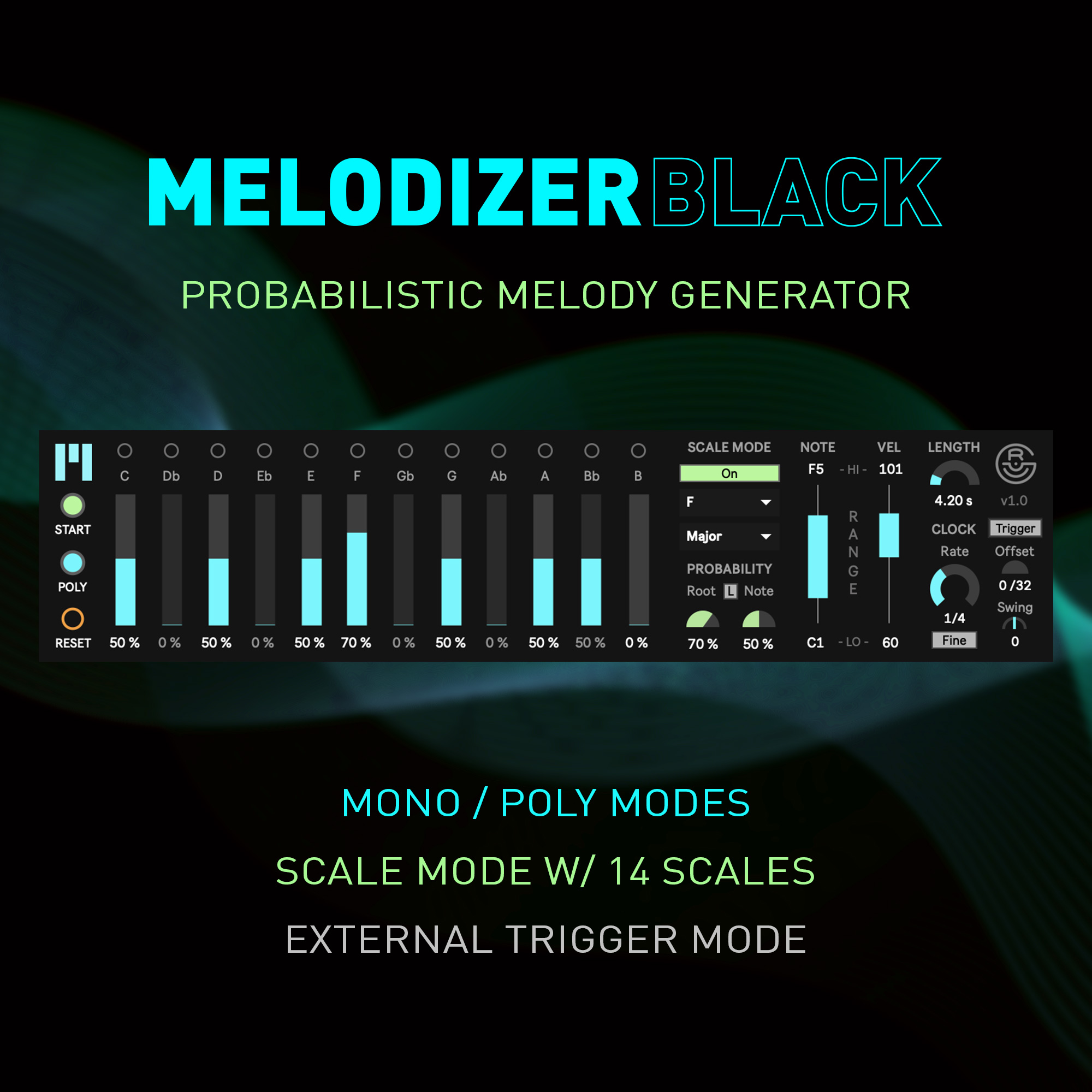 | Description: | Melodizer Black is a probabilistic melody generator which can generate notes in any scale you desire and has a rich feature set including 14 built-in scales, polyphonic/monophonic modes, individual note probability sliders, external trigger mode and note/velocity range sliders. The end results is a rather expressive stochastic melody machine with a ton of power! Probabilistic note generators can be useful for a myriad of explorative tasks but some of my inspiration in building Melodizer Black was to have a device that could be used as: - Accompaniment to any track, - Performance/conducting tool, changing parameters as you play. - Core platform for generative, ambient synthesis. - Exploration tool to find new melodies and chord progressions. FEATURES: - True probability - Trigger notes with the internal clock or enable external trigger mode which allows you to trigger notes from other MIDI sources to control rhythm - Polyphonic and Monophonic modes to generate chords or melodies - Robust scale mode which includes 14 scales to choose from and knobs to quickly adjust all probability sliders in your scale - Lights above each note that blink when that note is triggered - Adjustable sliders to limit the minimum and maximum note and velocity ranges for triggered notes - No voice limit - Note length up to 30 seconds - Fully mappable parameters - Push compatible More information and video can be found on the product page of my website. |