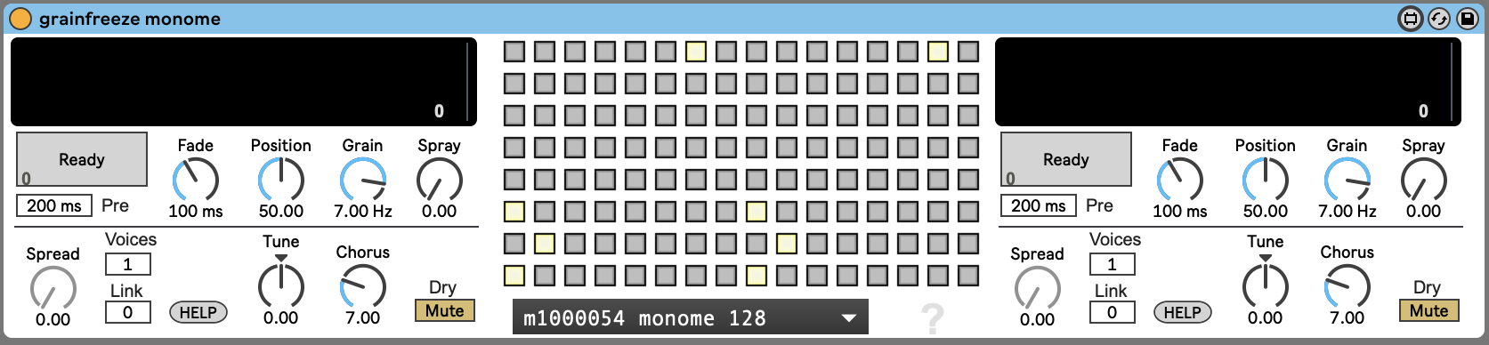 | Description: | This device is an adaptation of grainfreeze by Monolake https://maxforlive.com/library/device/240/grain-freeze It is shared under CC licence Attribution-NonCommercial-ShareAlike 4.0 International (CC BY-NC-SA 4.0) It is made of two (barely modified) grainfreeze devices, combined into a dual device for Monome. You can easily figure out how the monome controls the devices by testing while looking at m4l interface, I will go further in next releases with manual and upgrades, you can start by keeping in mind that Monome is split in 2 identical 8X8 grids https://www.instagram.com/p/BX2whf1DmRQ/?utm_source=ig_web_copy_link |