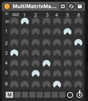 the matrix is inspired from the apematrix ios app. you can click the pacman dials and drag up to increase the volume for that connection. the top row are the inputs and the right most row are the outputs. for example: if you turn on the dry- out one(very top right dial), you just get a clean signal, no effects. if you turn on 1, then click+drag the 1 out (right side dial, 1 down from the dry out dial) you will send the input only through effect 1 to the output. you can do serial, parallel or even crazy feedback with this thing so put a limiter after this in your effects chain.