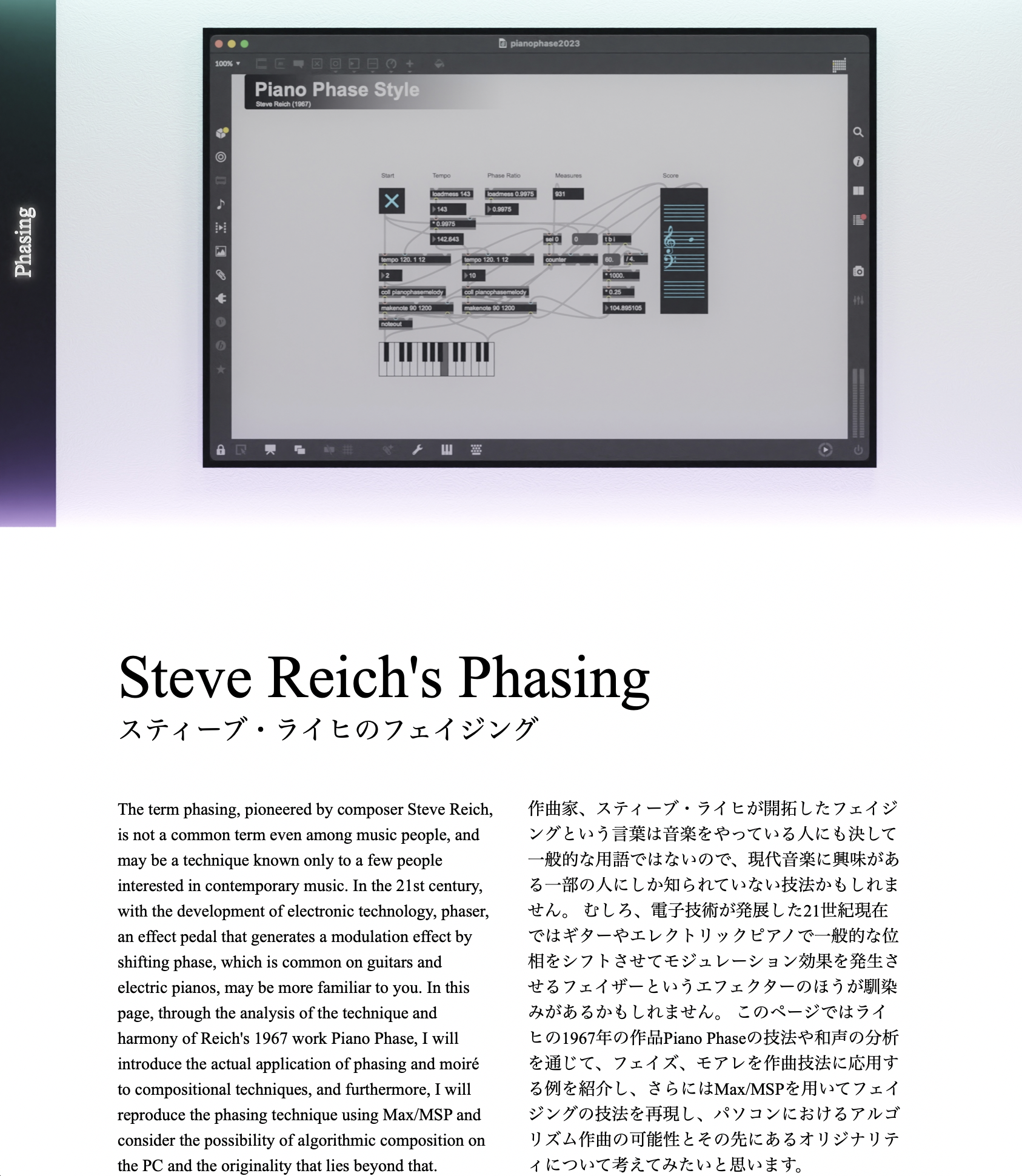 | Description: | The term phasing, pioneered by composer Steve Reich, is not a common term even among music people, and may be a technique known only to a few people interested in contemporary music. In the 21st century, with the development of electronic technology, phaser, an effect pedal that generates a modulation effect by shifting phase, which is common on guitars and electric pianos, may be more familiar to you. In this page, through the analysis of the technique and harmony of Reich's 1967 work Piano Phase, I will introduce the actual application of phasing and moiré to compositional techniques, and furthermore, I will reproduce the phasing technique using Max/MSP and consider the possibility of algorithmic composition on the PC and the originality that lies beyond that. |